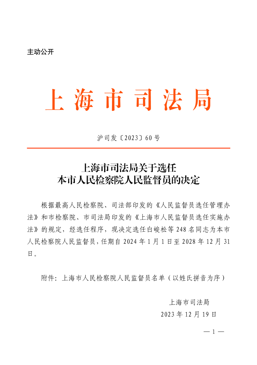 ??根據(jù)最高人民檢察院、司法部印發(fā)的《人民監(jiān)督員選任管理辦法》和市檢察院、市司法局印發(fā)的《上海市人民監(jiān)督員選任實施辦法》的規(guī)定,經(jīng)選任程序,現(xiàn)決定選任白峻松等248名同志為本市人民檢察院人民監(jiān)督員,任期自2024年1月1日至2028年12月31日。