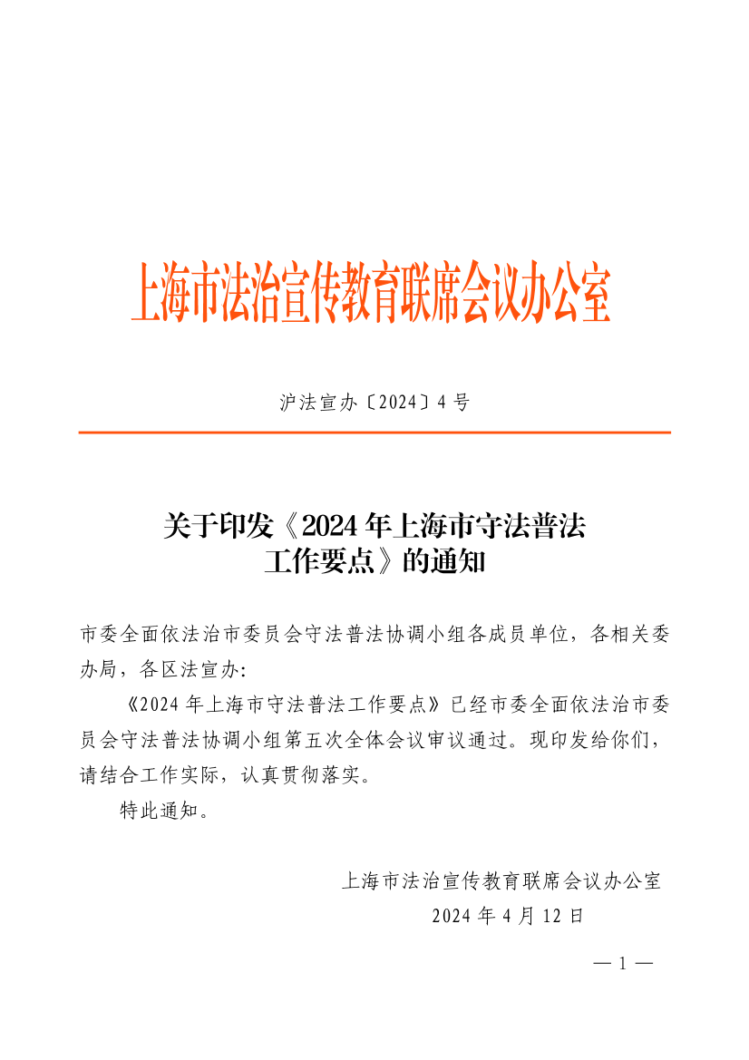 關于印發(fā)《2024年上海市守法普法工作要點》的通知