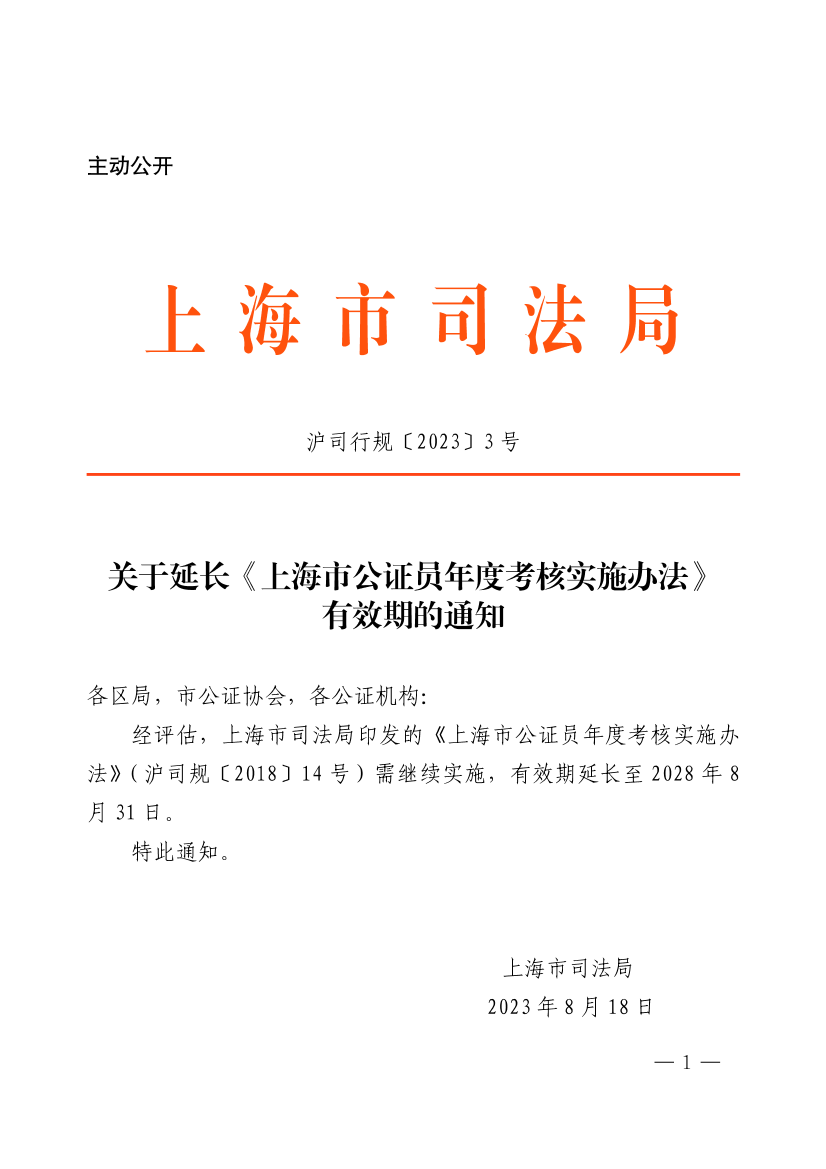 ??經(jīng)評(píng)估,上海市司法局印發(fā)的《上海市公證員年度考核實(shí)施辦法》(滬司規(guī)〔2018〕14號(hào))需繼續(xù)實(shí)施,有效期延長(zhǎng)至2028年8月31日。