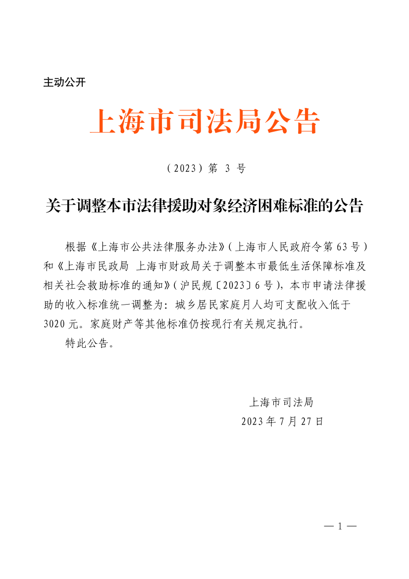 關(guān)于調(diào)整本市法律援助對象經(jīng)濟困難標(biāo)準(zhǔn)的公告