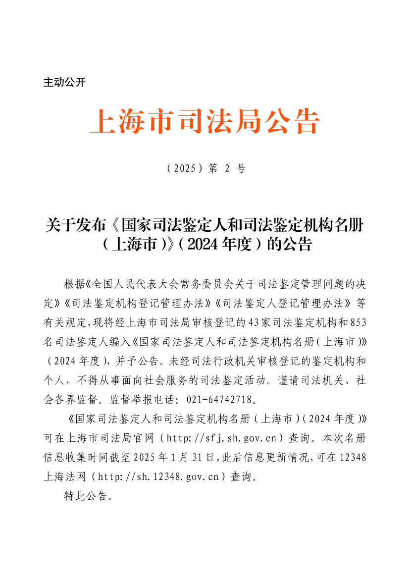 ??《國家司法鑒定人和司法鑒定機構(gòu)名冊(上海市)(2024年度)》可在上海市司法局官網(wǎng)(http://sfj.sh.gov.cn)查詢。本次名冊信息收集時間截至2025年1月31日,此后信息更新情況,可在12348上海法網(wǎng)(http://sh.12348.gov.cn)查詢。