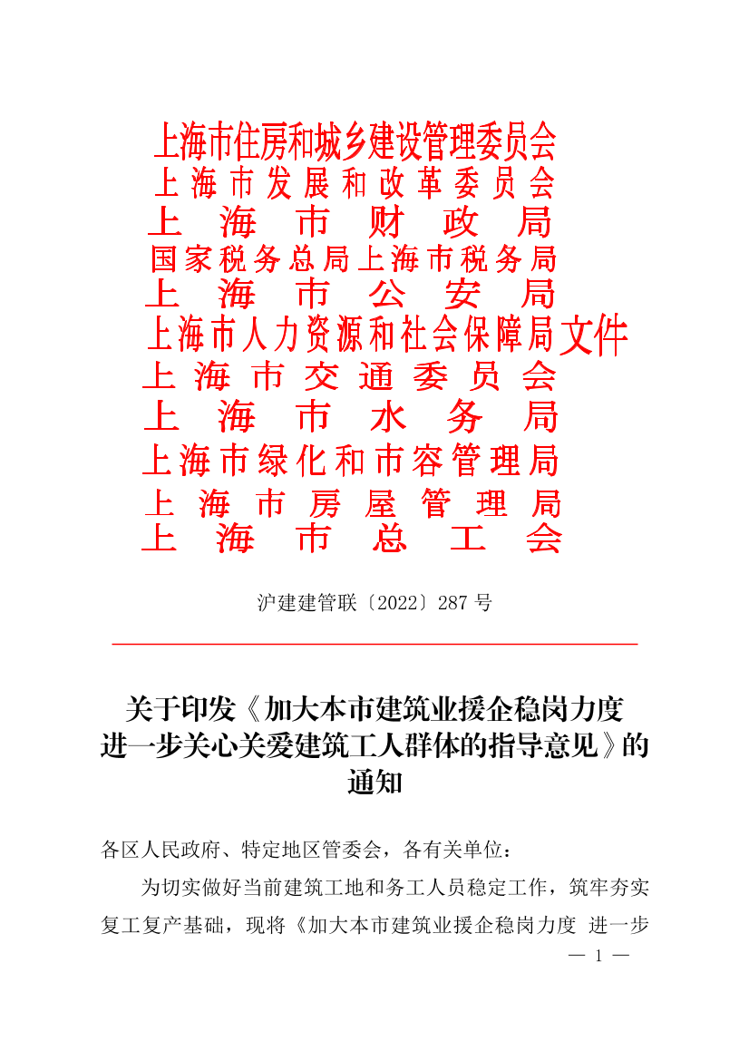 ??本市建筑業(yè)企業(yè)和廣大建筑工人群體為服務(wù)全市抗疫大局和經(jīng)濟(jì)社會(huì)發(fā)展發(fā)揮了重要作用。按照市委、市政府決策部署,為切實(shí)做好當(dāng)前建筑工地和務(wù)工人員穩(wěn)定工作,筑牢夯實(shí)復(fù)工復(fù)產(chǎn)基礎(chǔ),根據(jù)《上海市人民政府關(guān)于印發(fā)<上海市加快經(jīng)濟(jì)恢復(fù)和重振行動(dòng)方案>的通知》(滬府規(guī)〔2022〕5號(hào))等文件精神,現(xiàn)就加大建筑業(yè)援企穩(wěn)崗力度,進(jìn)一步關(guān)心關(guān)愛建筑工人群體提出如下指導(dǎo)意見: