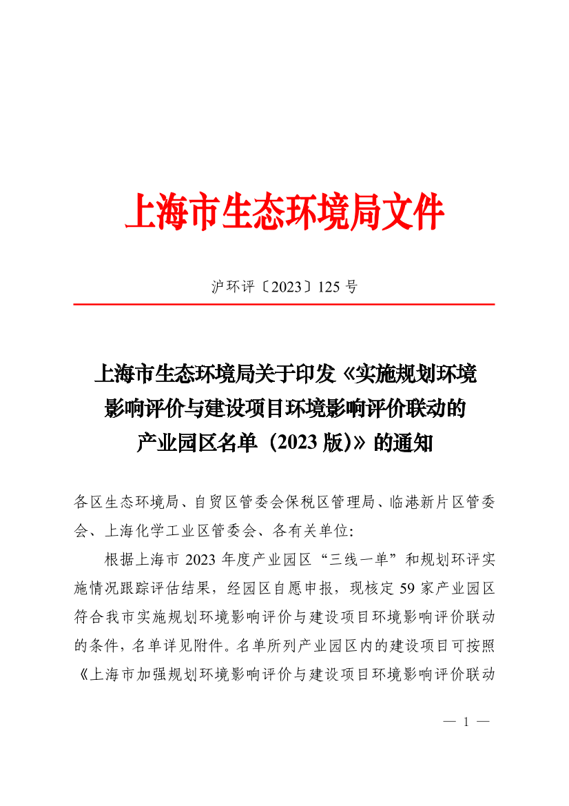 ??根據(jù)上海市2023年度產(chǎn)業(yè)園區(qū)“三線一單”和規(guī)劃環(huán)評實施情況跟蹤評估結(jié)果,經(jīng)園區(qū)自愿申報,現(xiàn)核定59家產(chǎn)業(yè)園區(qū)符合我市實施規(guī)劃環(huán)境影響評價與建設項目環(huán)境影響評價聯(lián)動的條件,名單詳見附件。名單所列產(chǎn)業(yè)園區(qū)內(nèi)的建設項目可按照《上海市加強規(guī)劃環(huán)境影響評價與建設項目環(huán)境影響評價聯(lián)動的實施意見》(滬環(huán)規(guī)〔2021〕6號)有關規(guī)定簡化項目環(huán)評管理。自本通知印發(fā)之日起,《實施規(guī)劃環(huán)境影響評價與建設項目環(huán)境影響評價聯(lián)動的區(qū)域名單(2022年度)》不再執(zhí)行。