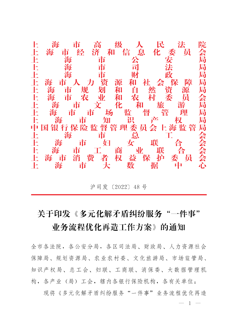 ??為深入推進(jìn)“一網(wǎng)通辦”和業(yè)務(wù)流程革命性再造,根據(jù)《上海市人民政府辦公廳關(guān)于以企業(yè)和群眾高效辦成“一件事”為目標(biāo)全面推進(jìn)業(yè)務(wù)流程革命性再造的指導(dǎo)意見》(滬府辦〔2020〕6號)、《上海市人民政府辦公廳印發(fā)〈2022年上海市全面深化“一網(wǎng)通辦”改革工作要點(diǎn)〉的通知》(滬府辦發(fā)〔2022〕1號)要求,經(jīng)研究,現(xiàn)就本市多元化解矛盾糾紛服務(wù)“一件事”(以下簡稱解紛“一件事”)業(yè)務(wù)流程優(yōu)化再造工作提出如下方案。
