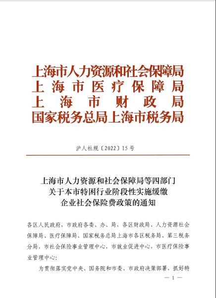??為貫徹落實黨中央、國務(wù)院和市委、市政府決策部署,抓好特困行業(yè)紓困政策落實,根據(jù)《人力資源社會保障部辦公廳國家稅務(wù)總局辦公廳關(guān)于特困行業(yè)階段性實施緩繳企業(yè)社會保險費政策的通知》(人社廳發(fā)〔2022〕16號)要求,結(jié)合本市實際,經(jīng)市政府同意,在確保企業(yè)職工各項社會保險待遇不受影響、按時足額支付的前提下,對本市特困行業(yè)階段性實施緩繳企業(yè)職工基本養(yǎng)老保險費、職工基本醫(yī)療保險費(含生育保險費,下同)、失業(yè)保險費、工傷保險費(以下簡稱“社會保險費”)政策。現(xiàn)就有關(guān)事項通知如下: