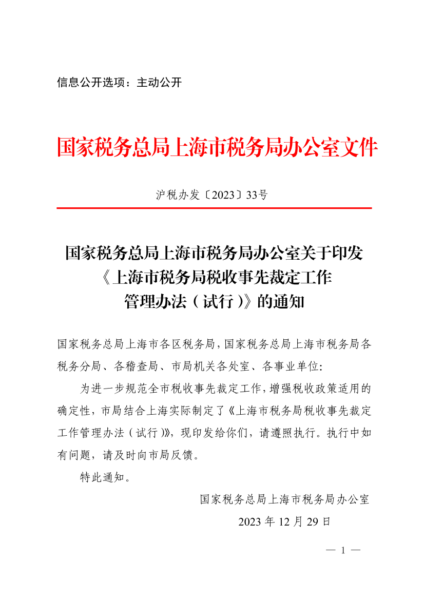 ??為進(jìn)一步規(guī)范全市稅收事先裁定工作,增強(qiáng)稅收政策適用的確定性,市局結(jié)合上海實際制定了《上海市稅務(wù)局稅收事先裁定工作管理辦法(試行)》,現(xiàn)印發(fā)給你們,請遵照執(zhí)行。執(zhí)行中如有問題,請及時向市局反饋。