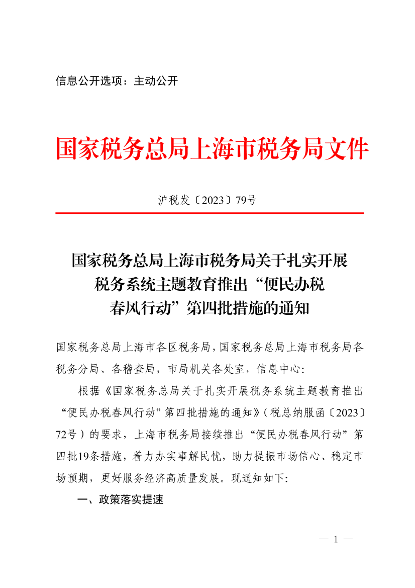 ??根據(jù)《國家稅務(wù)總局關(guān)于扎實開展稅務(wù)系統(tǒng)主題教育推出“便民辦稅春風行動”第四批措施的通知》(稅總納服函〔2023〕72號)的要求,上海市稅務(wù)局接續(xù)推出“便民辦稅春風行動”第四批19條措施,著力辦實事解民憂,助力提振市場信心、穩(wěn)定市場預期,更好服務(wù)經(jīng)濟高質(zhì)量發(fā)展?,F(xiàn)通知如下: