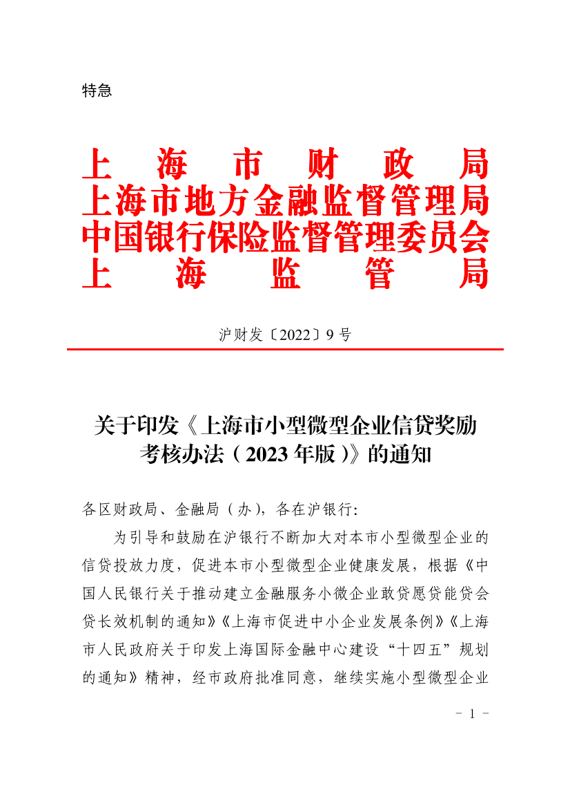 ??為引導(dǎo)和鼓勵(lì)在滬銀行不斷加大對(duì)本市小型微型企業(yè)的信貸投放力度,促進(jìn)本市小型微型企業(yè)健康發(fā)展,根據(jù)《中國(guó)人民銀行關(guān)于推動(dòng)建立金融服務(wù)小微企業(yè)敢貸愿貸能貸會(huì)貸長(zhǎng)效機(jī)制的通知》《上海市促進(jìn)中小企業(yè)發(fā)展條例》《上海市人民政府關(guān)于印發(fā)上海國(guó)際金融中心建設(shè)“十四五”規(guī)劃的通知》精神,經(jīng)市政府批準(zhǔn)同意,繼續(xù)實(shí)施小型微型企業(yè)信貸獎(jiǎng)勵(lì)考核辦法,對(duì)在2022年-2023年中,本市小微企業(yè)信貸工作突出的在滬銀行實(shí)施專項(xiàng)獎(jiǎng)勵(lì)。為切實(shí)做好獎(jiǎng)勵(lì)考核工作,我們制定了《上海市小型微型企業(yè)信貸獎(jiǎng)勵(lì)考核辦法(2023年版)》,現(xiàn)印發(fā)給你們,請(qǐng)按照?qǐng)?zhí)行。