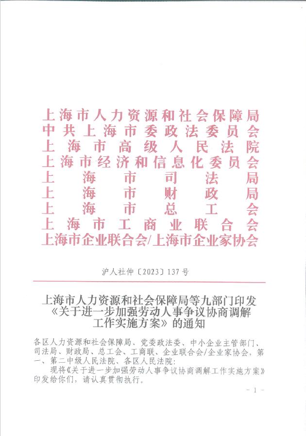 上海市人力資源和社會(huì)保障局等九部門印發(fā)《關(guān)于進(jìn)一步加強(qiáng)勞動(dòng)人事爭議協(xié)商調(diào)解工作實(shí)施方案》的通知