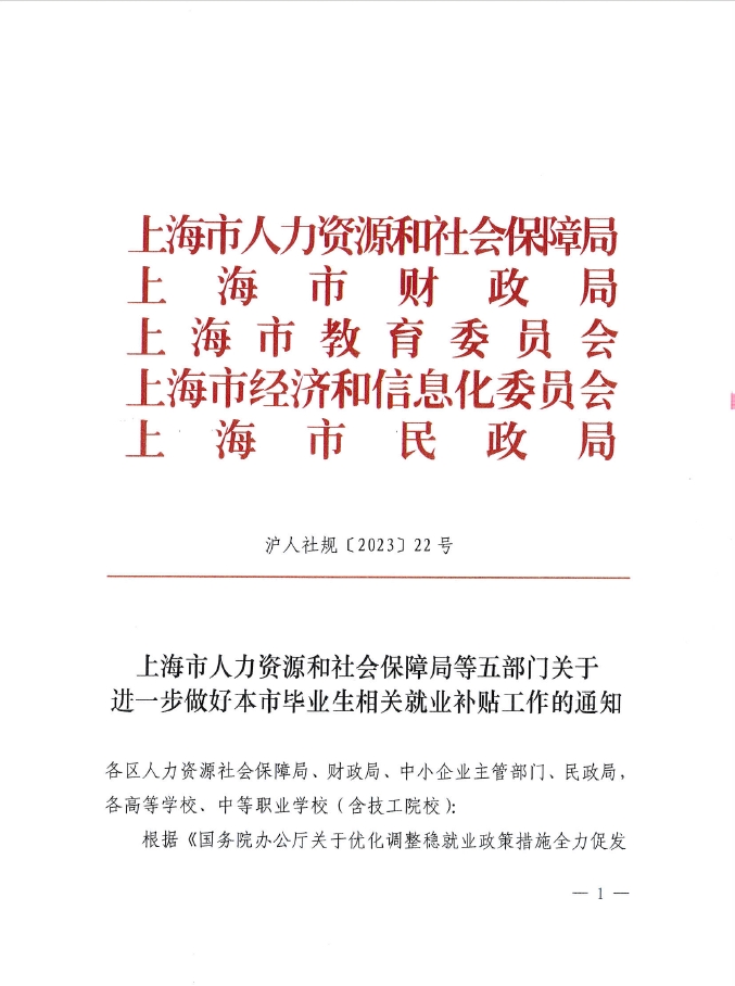 根據(jù)《國(guó)務(wù)院辦公廳關(guān)于優(yōu)化調(diào)整穩(wěn)就業(yè)政策措施全力促發(fā)展惠民生的通知》(國(guó)辦發(fā)〔2023〕11號(hào))、《國(guó)務(wù)院辦公廳關(guān)于進(jìn)一步做好高校畢業(yè)生等青年就業(yè)創(chuàng)業(yè)工作的通知》(國(guó)辦發(fā)〔2022〕13號(hào))、《上海市人民政府關(guān)于做好本市當(dāng)前和今后一個(gè)時(shí)期穩(wěn)就業(yè)工作的意見(jiàn)》(滬府規(guī)〔2022〕6號(hào))相關(guān)規(guī)定,現(xiàn)就做好本市畢業(yè)生就業(yè)補(bǔ)貼相關(guān)工作通知如下: