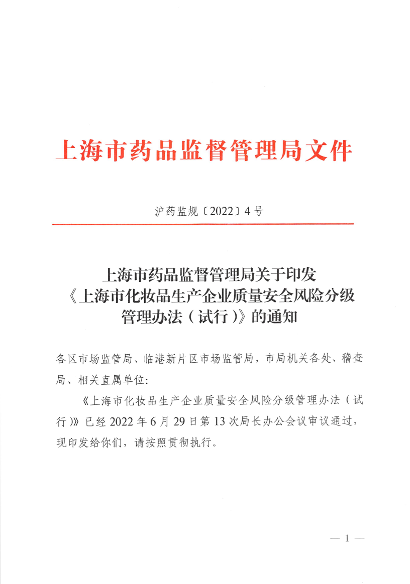 《上海市化妝品生產(chǎn)企業(yè)質量安全風險分級管理辦法(試行)》已經(jīng)2022年6月29日第13次局長辦公會議審議通過,現(xiàn)印發(fā)給你們,請按照貫徹執(zhí)行。