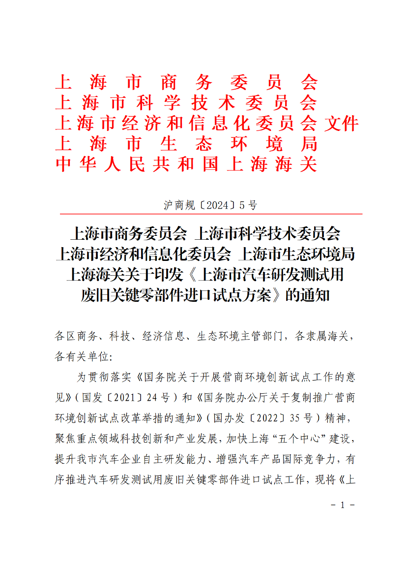 ??為貫徹落實(shí)《國(guó)務(wù)院關(guān)于開展?fàn)I商環(huán)境創(chuàng)新試點(diǎn)工作的意見》(國(guó)發(fā)〔2021〕24號(hào))和《國(guó)務(wù)院辦公廳關(guān)于復(fù)制推廣營(yíng)商環(huán)境創(chuàng)新試點(diǎn)改革舉措的通知》(國(guó)辦發(fā)〔2022〕35號(hào))精神,聚焦重點(diǎn)領(lǐng)域科技創(chuàng)新和產(chǎn)業(yè)發(fā)展,加快上?!拔鍌€(gè)中心”建設(shè),提升我市汽車企業(yè)自主研發(fā)能力、增強(qiáng)汽車產(chǎn)品國(guó)際競(jìng)爭(zhēng)力,有序推進(jìn)汽車研發(fā)測(cè)試用廢舊關(guān)鍵零部件進(jìn)口試點(diǎn)工作,現(xiàn)將《上海市汽車研發(fā)測(cè)試用廢舊關(guān)鍵零部件進(jìn)口試點(diǎn)方案》印發(fā)給你們,請(qǐng)遵照?qǐng)?zhí)行。