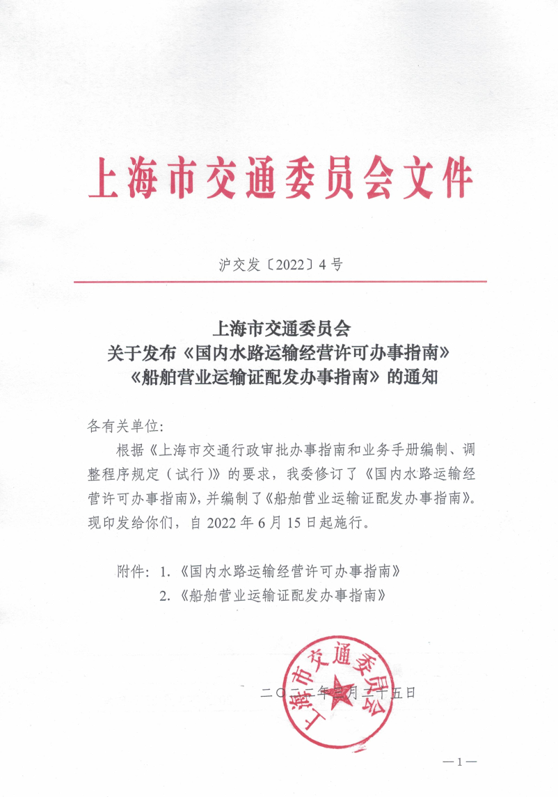 ??根據(jù)《上海市交通行政審批辦事指南和業(yè)務(wù)手冊編制、調(diào)整程序規(guī)定(試行)》的要求,我委修訂了《國內(nèi)水路運輸經(jīng)營許可辦事指南》,并編制了《船舶營業(yè)運輸證配發(fā)辦事指南》。現(xiàn)印發(fā)給你們,自2022年6月15日起施行。