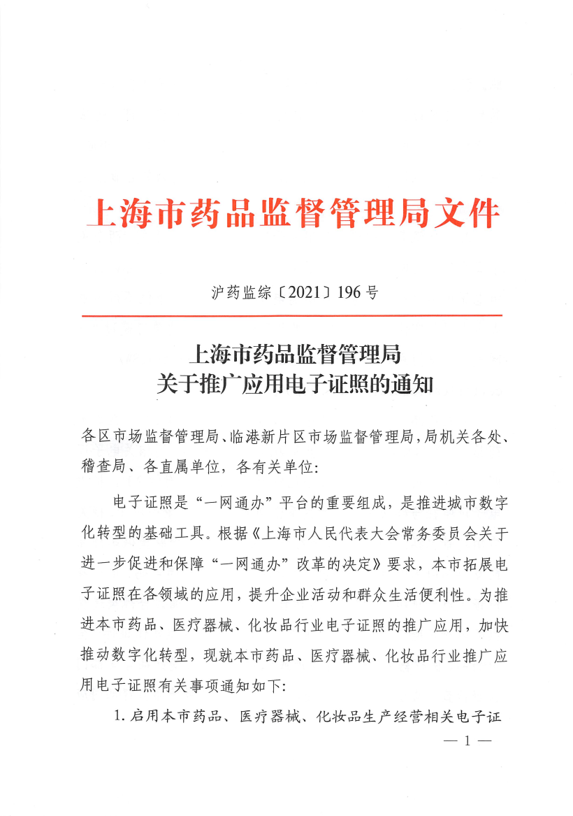 ??電子證照是“一網(wǎng)通辦”平臺(tái)的重要組成,是推進(jìn)城市數(shù)字化轉(zhuǎn)型的基礎(chǔ)工具。根據(jù)《上海市人民代表大會(huì)常務(wù)委員會(huì)關(guān)于進(jìn)一步促進(jìn)和保障“一網(wǎng)通辦”改革的決定》要求,本市拓展電子證照在各領(lǐng)域的應(yīng)用,提升企業(yè)活動(dòng)和群眾生活便利性。為推進(jìn)本市藥品、醫(yī)療器械、化妝品行業(yè)電子證照的推廣應(yīng)用,加快推動(dòng)數(shù)字化轉(zhuǎn)型,現(xiàn)就本市藥品、醫(yī)療器械、化妝品行業(yè)推廣應(yīng)用電子證照有關(guān)事項(xiàng)通知如下: