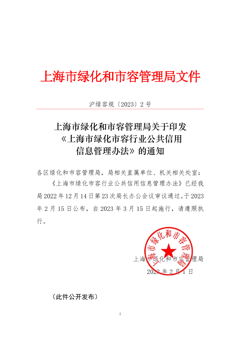 ??《上海市綠化市容行業(yè)公共信用信息管理辦法》已經我局2022年12月14日第23次局長辦公會議審議通過。于2023年2月15日公布,自2023年3月15日起施行,請遵照執(zhí)行。