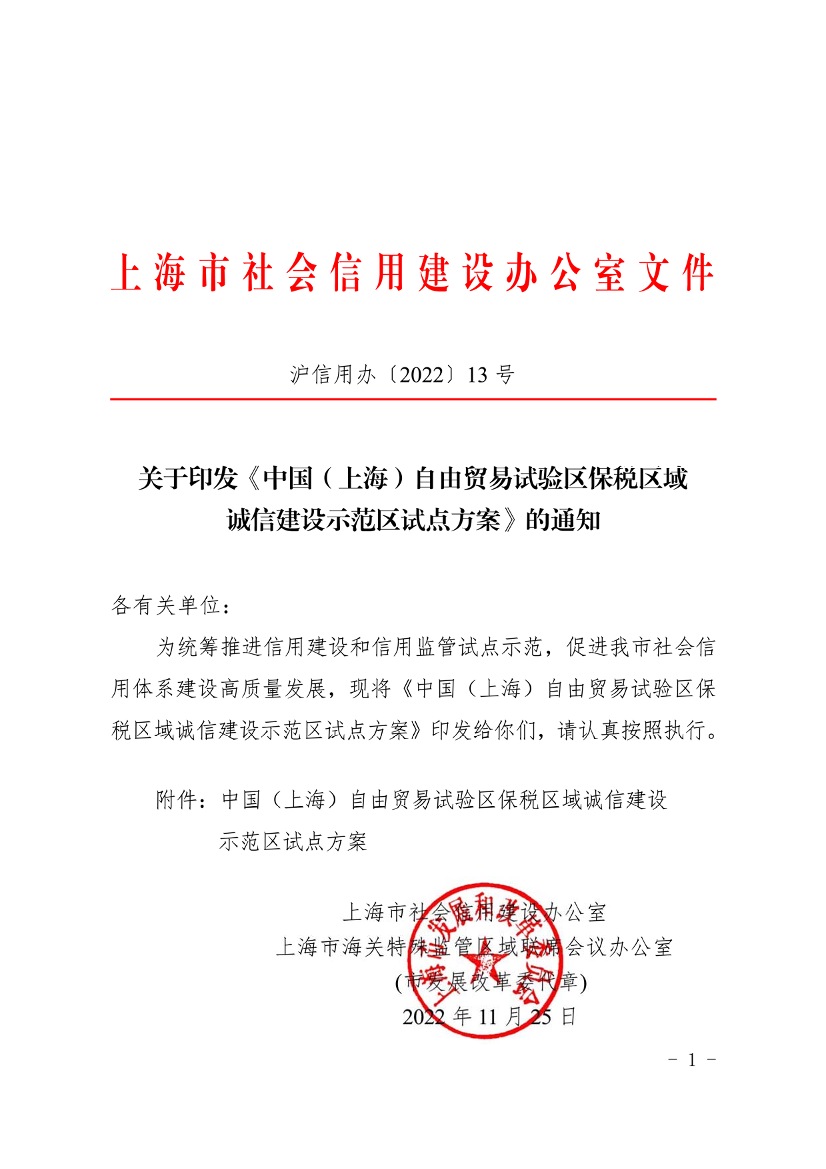 ??為統(tǒng)籌推進(jìn)信用建設(shè)和信用監(jiān)管試點(diǎn)示范,促進(jìn)我市社會(huì)信用體系建設(shè)高質(zhì)量發(fā)展,現(xiàn)將《中國(guó)(上海)自由貿(mào)易試驗(yàn)區(qū)保稅區(qū)域誠(chéng)信建設(shè)示范區(qū)試點(diǎn)方案》印發(fā)給你們,請(qǐng)認(rèn)真按照?qǐng)?zhí)行。