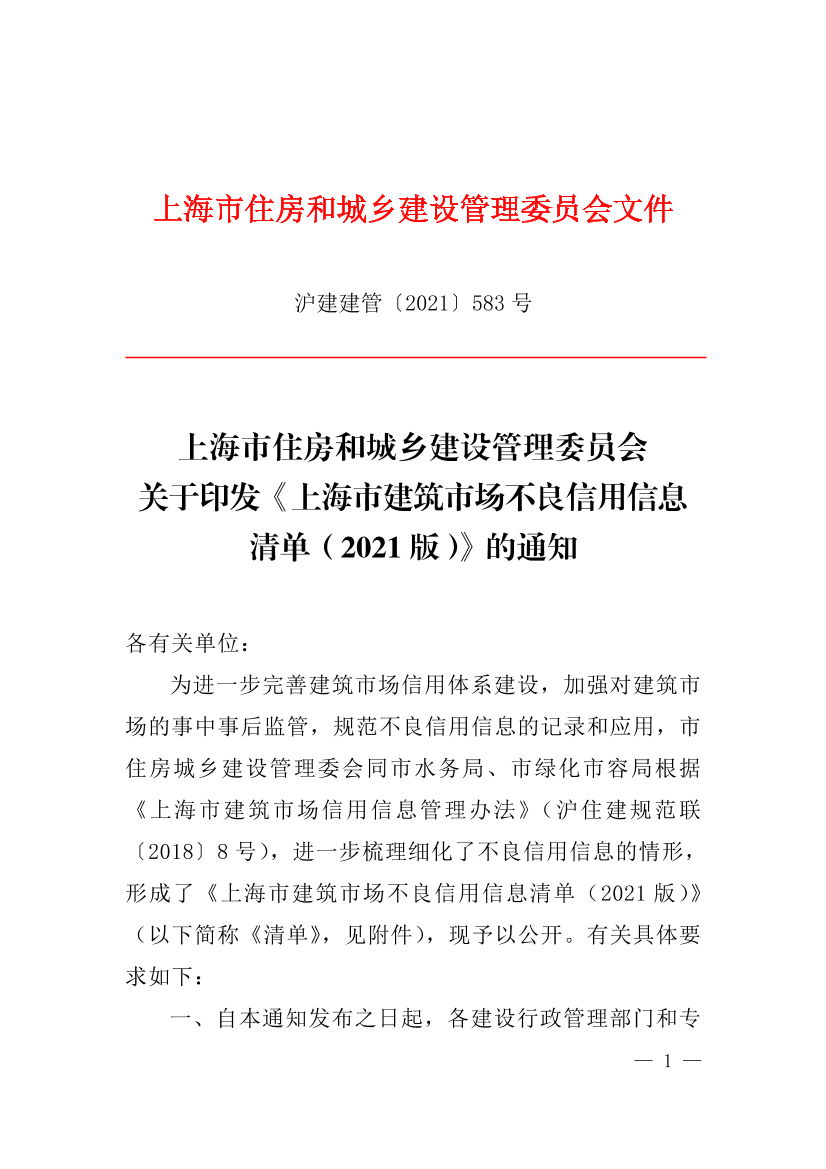 關于印發(fā)《上海市建筑市場不良信用信息清單(2021版)》的通知