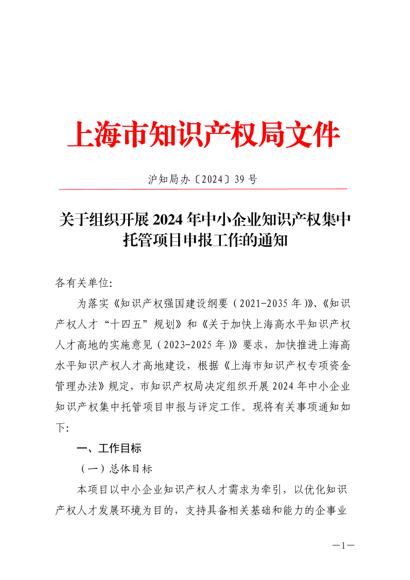 ??為落實(shí)《知識(shí)產(chǎn)權(quán)強(qiáng)國(guó)建設(shè)綱要(2021-2035年)》、《知識(shí)產(chǎn)權(quán)人才“十四五”規(guī)劃》和《關(guān)于加快上海高水平知識(shí)產(chǎn)權(quán)人才高地的實(shí)施意見(jiàn)(2023-2025年)》要求,加快推進(jìn)上海高水平知識(shí)產(chǎn)權(quán)人才高地建設(shè),根據(jù)《上海市知識(shí)產(chǎn)權(quán)專項(xiàng)資金管理辦法》規(guī)定,市知識(shí)產(chǎn)權(quán)局決定組織開(kāi)展2024年中小企業(yè)知識(shí)產(chǎn)權(quán)集中托管項(xiàng)目申報(bào)與評(píng)定工作?,F(xiàn)將有關(guān)事項(xiàng)通知如下: