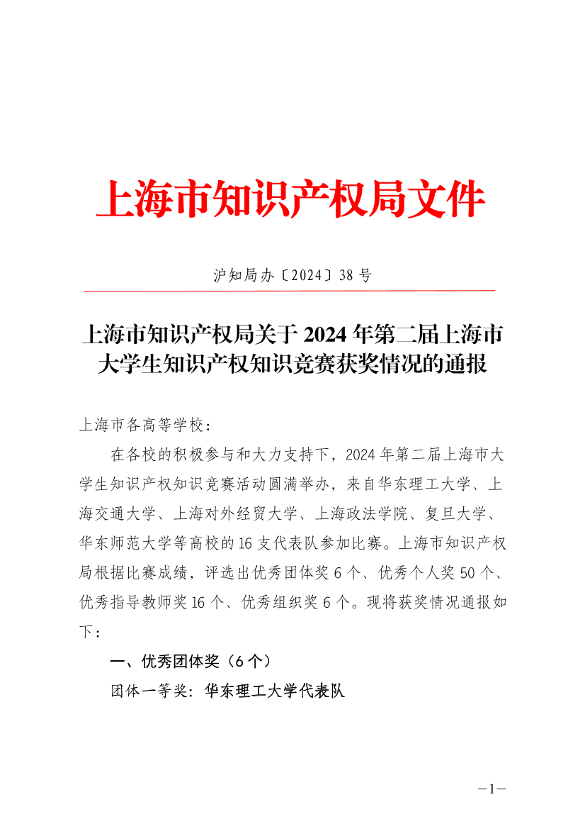 上海市知識(shí)產(chǎn)權(quán)局關(guān)于2024年第二屆上海市大學(xué)生知識(shí)產(chǎn)權(quán)知識(shí)競賽獲獎(jiǎng)情況的通報(bào)