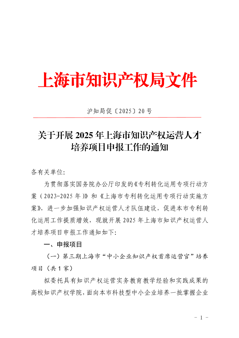 ??為貫徹落實國務(wù)院辦公廳印發(fā)的《專利轉(zhuǎn)化運用專項行動方案(2023-2025年)》和《上海市專利轉(zhuǎn)化運用專項行動實施方案》,進一步加強知識產(chǎn)權(quán)運營人才隊伍建設(shè),促進本市專利轉(zhuǎn)化運用工作提質(zhì)增效,現(xiàn)就開展2025年上海市知識產(chǎn)權(quán)運營人才培養(yǎng)項目申報工作通知如下: