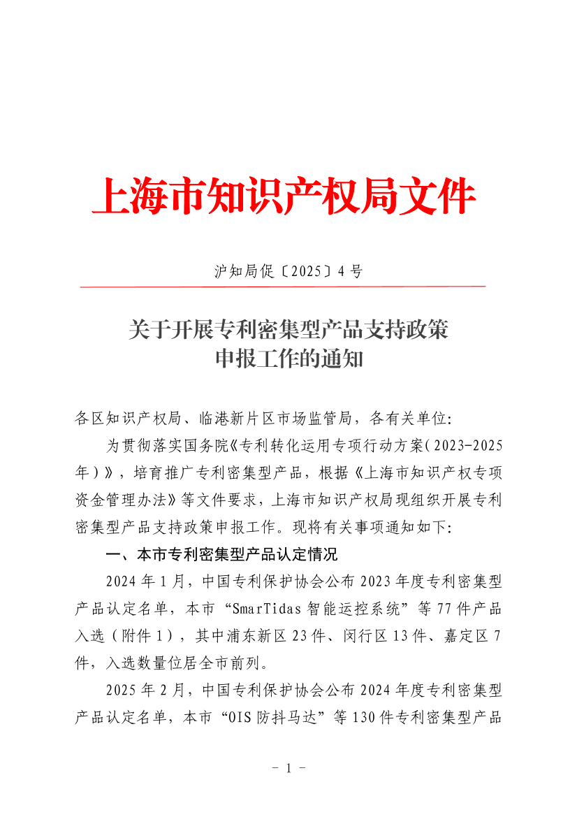 ??為貫徹落實國務(wù)院《專利轉(zhuǎn)化運用專項行動方案(2023-2025年)》,培育推廣專利密集型產(chǎn)品,根據(jù)《上海市知識產(chǎn)權(quán)專項資金管理辦法》等文件要求,上海市知識產(chǎn)權(quán)局現(xiàn)組織開展專利密集型產(chǎn)品支持政策申報工作?,F(xiàn)將有關(guān)事項通知如下: