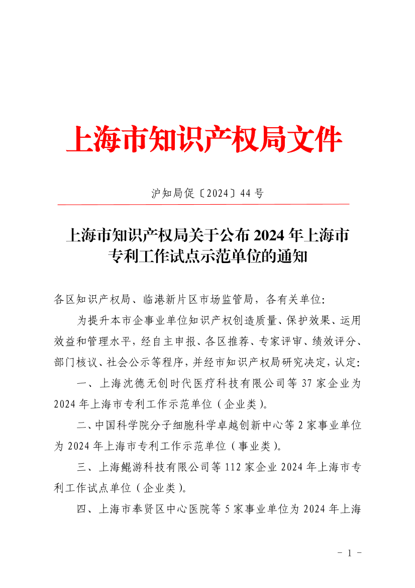 ??一、上海沈德無創(chuàng)時代醫(yī)療科技有限公司等37家企業(yè)為2024年上海市專利工作示范單位(企業(yè)類)。