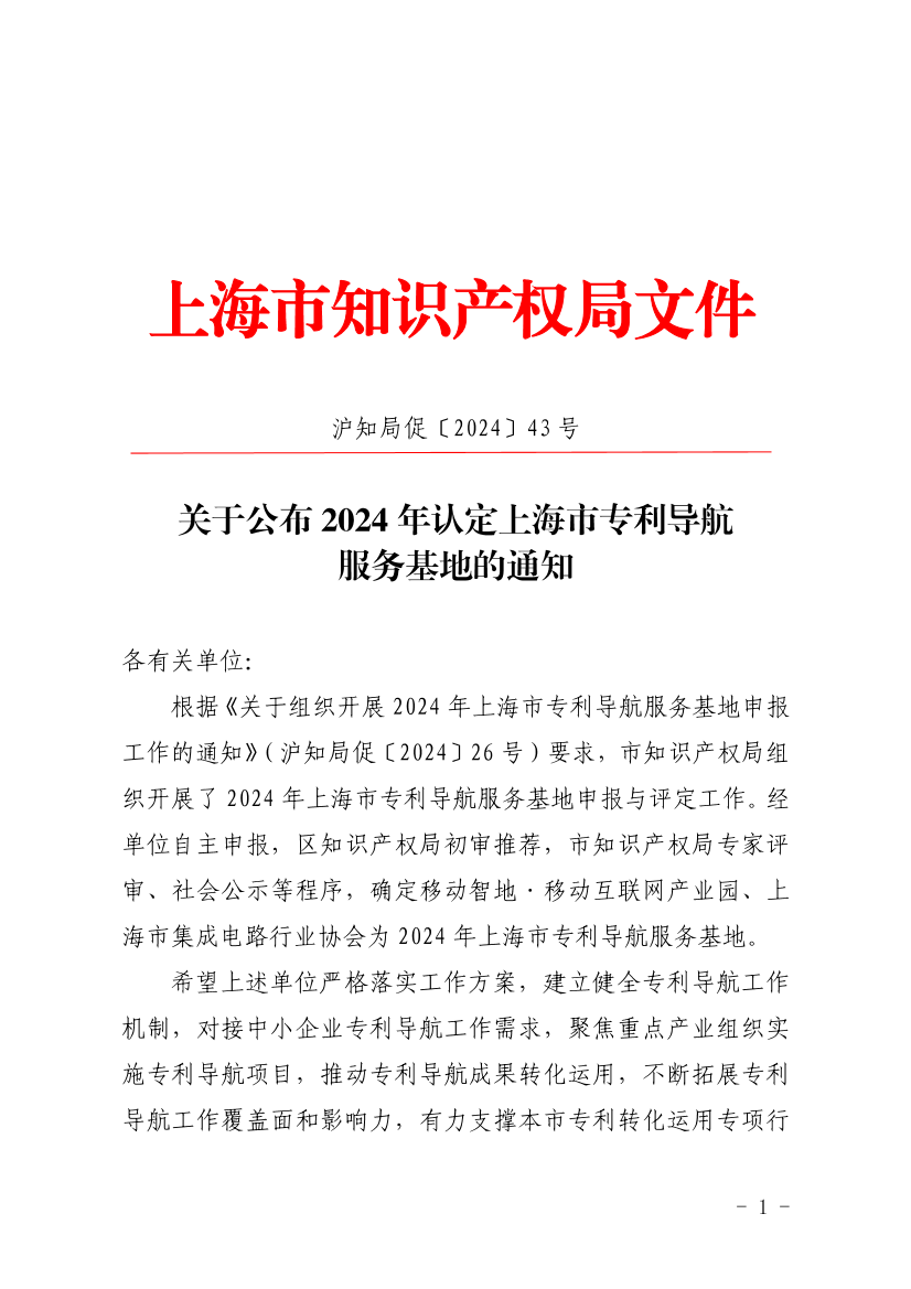 ??根據(jù)《關(guān)于組織開展2024年上海市專利導(dǎo)航服務(wù)基地申報工作的通知》(滬知局促〔2024〕26號)要求,市知識產(chǎn)權(quán)局組織開展了2024年上海市專利導(dǎo)航服務(wù)基地申報與評定工作。經(jīng)單位自主申報,區(qū)知識產(chǎn)權(quán)局初審?fù)扑],市知識產(chǎn)權(quán)局專家評審、社會公示等程序,確定移動智地·移動互聯(lián)網(wǎng)產(chǎn)業(yè)園、上海市集成電路行業(yè)協(xié)會為2024年上海市專利導(dǎo)航服務(wù)基地。
