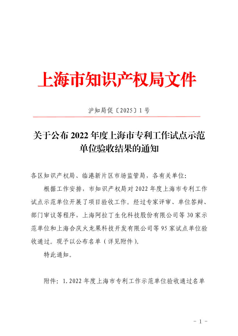 ??根據(jù)工作安排,市知識產(chǎn)權(quán)局對2022年度上海市專利工作試點示范單位開展了項目驗收工作。經(jīng)過專家評審、單位答辯、部門審議等程序,上海阿拉丁生化科技股份有限公司等30家示范單位和上海合慶火龍果科技開發(fā)有限公司等95家試點單位驗收通過?,F(xiàn)予以公布名單(詳見附件)。