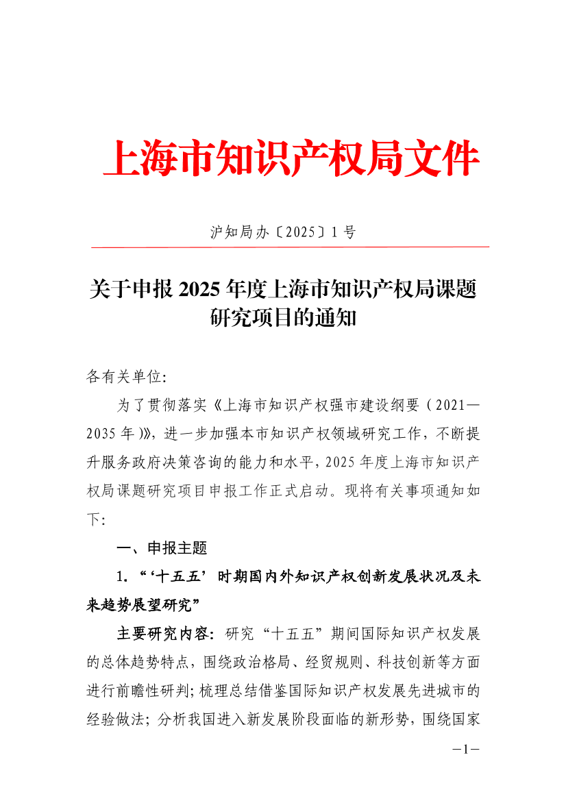 ??為了貫徹落實(shí)《上海市知識產(chǎn)權(quán)強(qiáng)市建設(shè)綱要(2021—2035年)》,進(jìn)一步加強(qiáng)本市知識產(chǎn)權(quán)領(lǐng)域研究工作,不斷提升服務(wù)政府決策咨詢的能力和水平,2025年度上海市知識產(chǎn)權(quán)局課題研究項(xiàng)目申報工作正式啟動。現(xiàn)將有關(guān)事項(xiàng)通知如下: