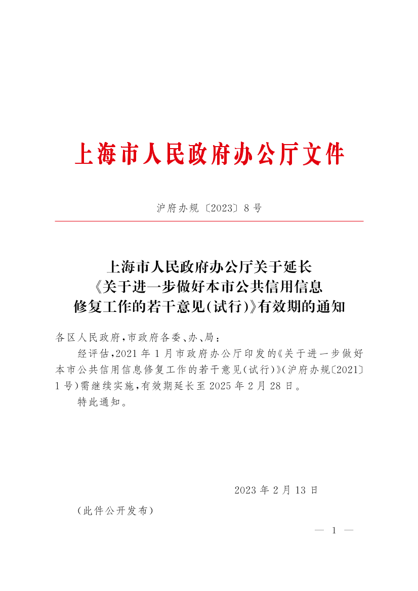 ??經(jīng)評(píng)估,2021年1月市政府辦公廳印發(fā)的《關(guān)于進(jìn)一步做好本市公共信用信息修復(fù)工作的若干意見(jiàn)(試行)》(滬府辦規(guī)〔2021〕1號(hào))需繼續(xù)實(shí)施,有效期延長(zhǎng)至2025年2月28日。