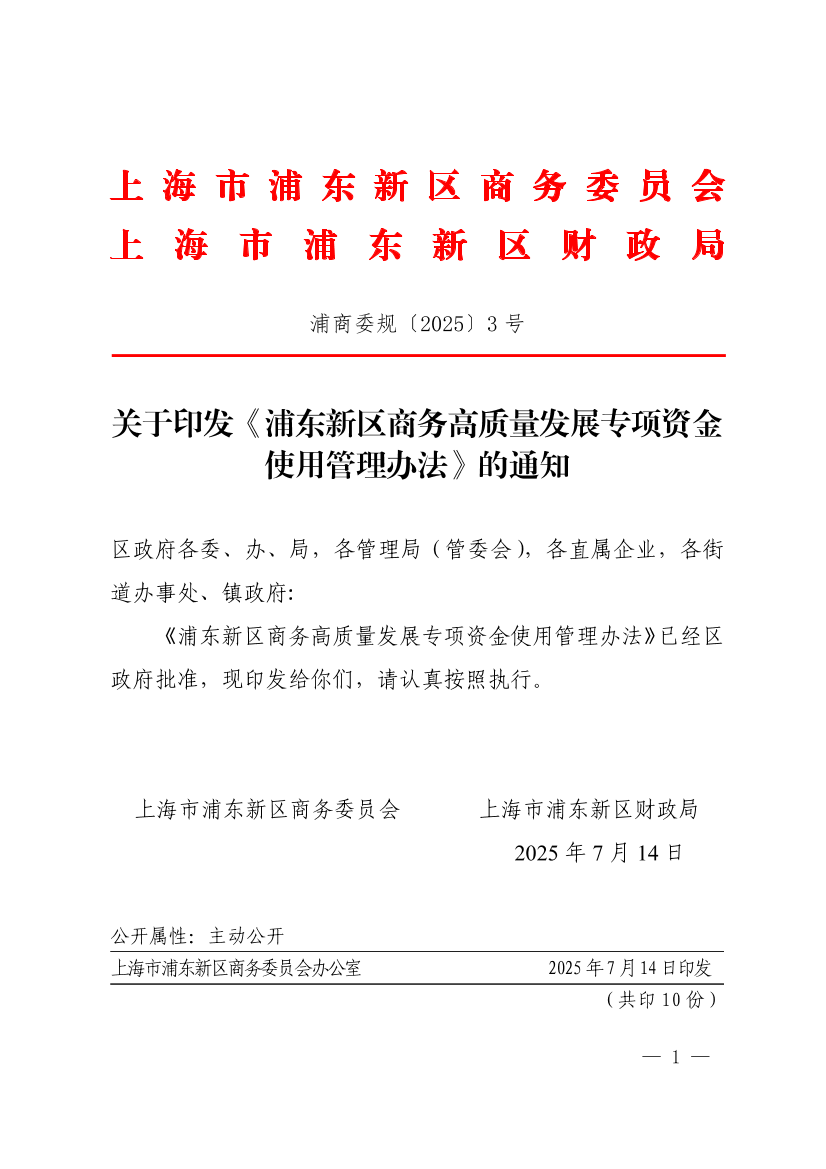 浦東新區(qū)商務(wù)高質(zhì)量發(fā)展專項資金使用管理辦法