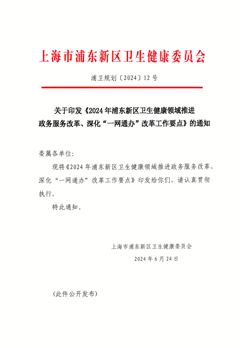 關(guān)于印發(fā)《2024年浦東新區(qū)衛(wèi)生健康領(lǐng)域推進(jìn)政務(wù)服務(wù)改革、深化“一網(wǎng)通辦”改革工作要點(diǎn)》的通知