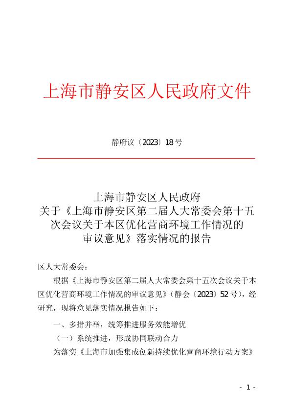 ??根據(jù)《上海市靜安區(qū)第二屆人大常委會第十五次會議關(guān)于本區(qū)優(yōu)化營商環(huán)境工作情況的審議意見》(靜會〔2023〕52號),經(jīng)研究,現(xiàn)將意見落實(shí)情況報(bào)告如下: