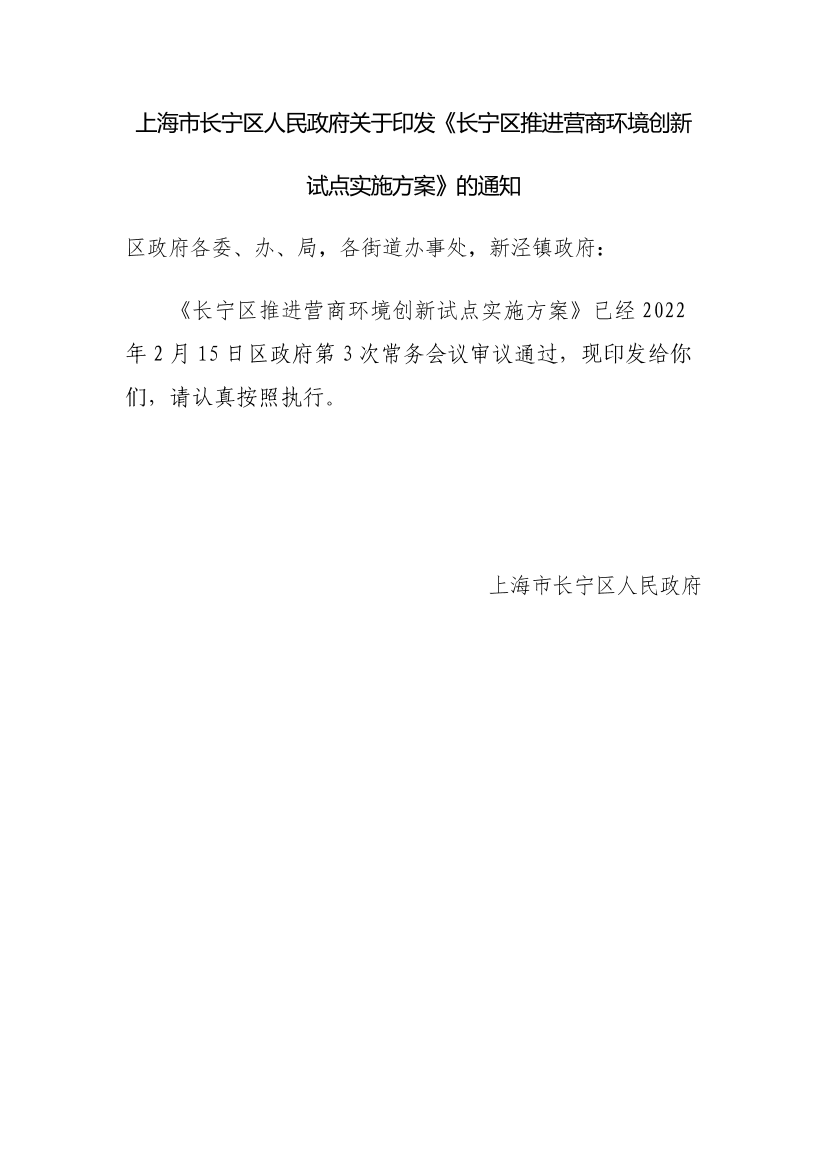 ??《長(zhǎng)寧區(qū)推進(jìn)營(yíng)商環(huán)境創(chuàng)新試點(diǎn)實(shí)施方案》已經(jīng)2022年2月15日區(qū)政府第3次常務(wù)會(huì)議審議通過(guò),現(xiàn)印發(fā)給你們,請(qǐng)認(rèn)真按照?qǐng)?zhí)行。