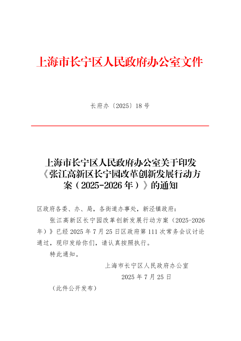 ??張江高新區(qū)長寧園改革創(chuàng)新發(fā)展行動方案(2025-2026年)》已經(jīng)2025年7月25日區(qū)政府第111次常務(wù)會議討論通過,現(xiàn)印發(fā)給你們,請認真按照執(zhí)行。