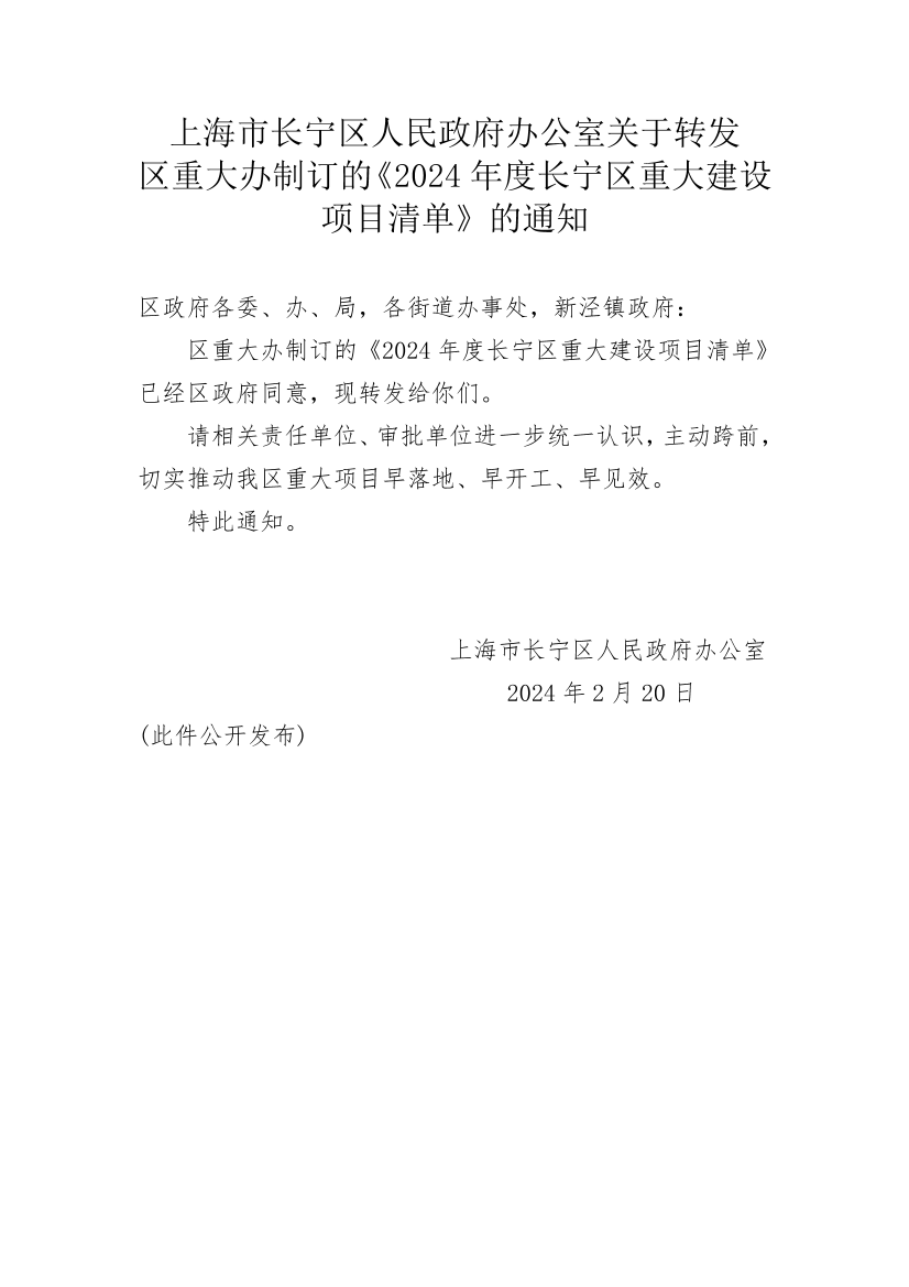 上海市長(zhǎng)寧區(qū)人民政府辦公室關(guān)于轉(zhuǎn)發(fā)區(qū)重大辦制訂的《2024年度長(zhǎng)寧區(qū)重大建設(shè)項(xiàng)目清單》的通知