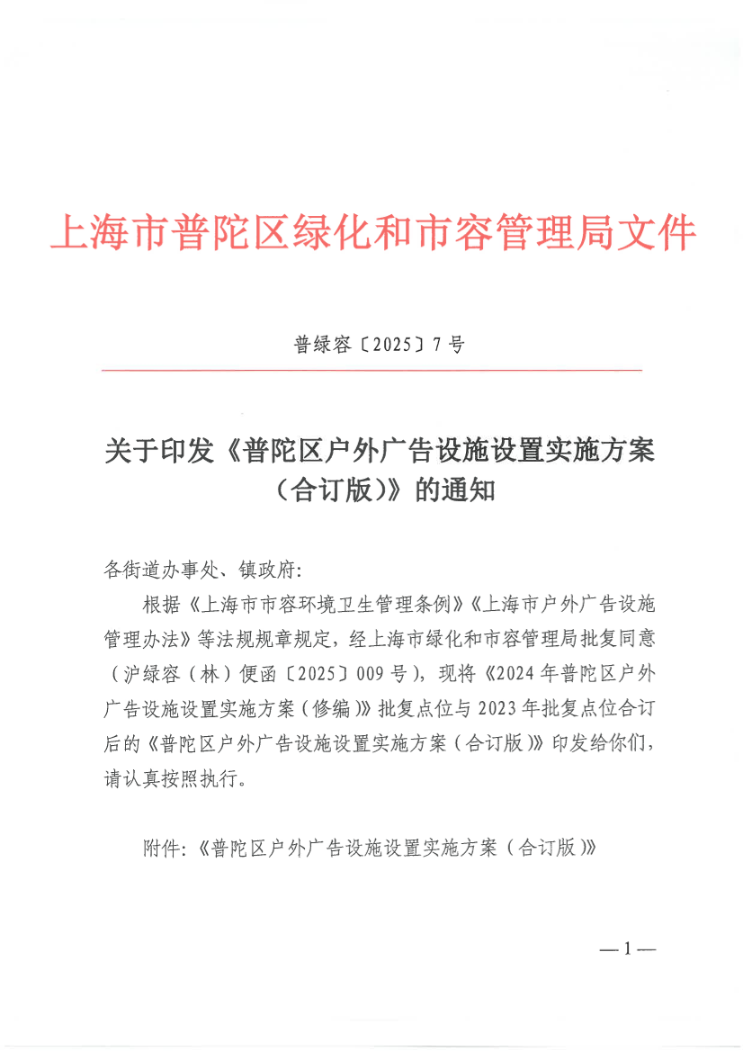 ??根據(jù)《上海市市容環(huán)境衛(wèi)生管理條例》《上海市戶外廣告設施管理辦法》等法規(guī)規(guī)章規(guī)定,經上海市綠化和市容管理局批復同意(滬綠容(林)便函〔2025〕009號),現(xiàn)將《2024年普陀區(qū)戶外廣告設施設置實施方案(修編)》批復點位與2023年批復點位合訂后的《普陀區(qū)戶外廣告設施設置實施方案(合訂版)》印發(fā)給你們,請認真按照執(zhí)行。