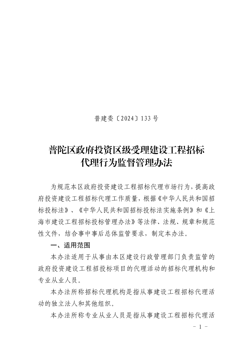 ??為規(guī)范本區(qū)政府投資建設(shè)工程招標代理市場行為,提高政府投資建設(shè)工程招標代理工作質(zhì)量,根據(jù)《中華人民共和國招標投標法》、《中華人民共和國招標投標法實施條例》和《上海市建設(shè)工程招標投標管理辦法》等法律、法規(guī)、規(guī)章和規(guī)范性文件,結(jié)合事中事后總體監(jiān)管要求,制定本辦法。