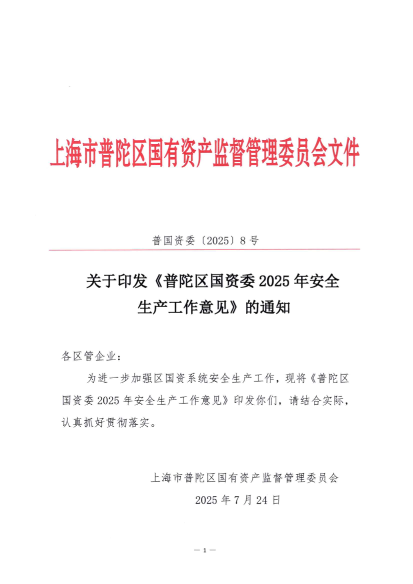 ??為進(jìn)一步加強(qiáng)區(qū)國資系統(tǒng)安全生產(chǎn)工作,現(xiàn)將《普陀區(qū)國資委2025年安全生產(chǎn)工作意見》印發(fā)你們,請結(jié)合實(shí)際,認(rèn)真抓好貫徹落實(shí)。