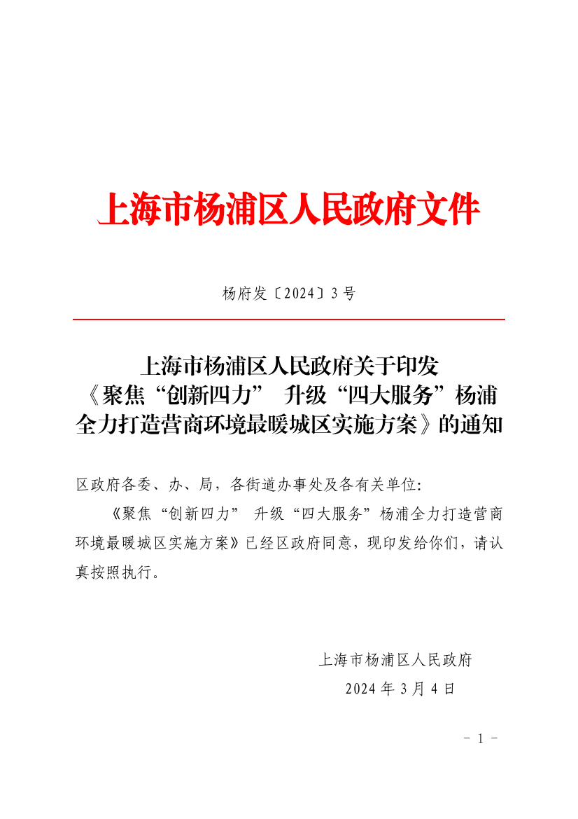 ??《聚焦“創(chuàng)新四力” 升級“四大服務(wù)”楊浦全力打造營商環(huán)境最暖城區(qū)實(shí)施方案》已經(jīng)區(qū)政府同意,現(xiàn)印發(fā)給你們,請認(rèn)真按照執(zhí)行。