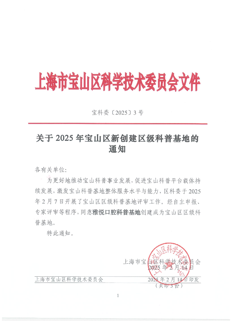 ??為更好地推動寶山科普事業(yè)發(fā)展,促進寶山科普平臺載體持續(xù)發(fā)展,激發(fā)寶山科普基地整體服務(wù)水平與能力,區(qū)科委于2025年2月7日開展了寶山區(qū)區(qū)級科普基地評審工作。經(jīng)自主申報、專家評審等程序,同意雅悅口腔科普基地創(chuàng)建成為寶山區(qū)區(qū)級科普基地。