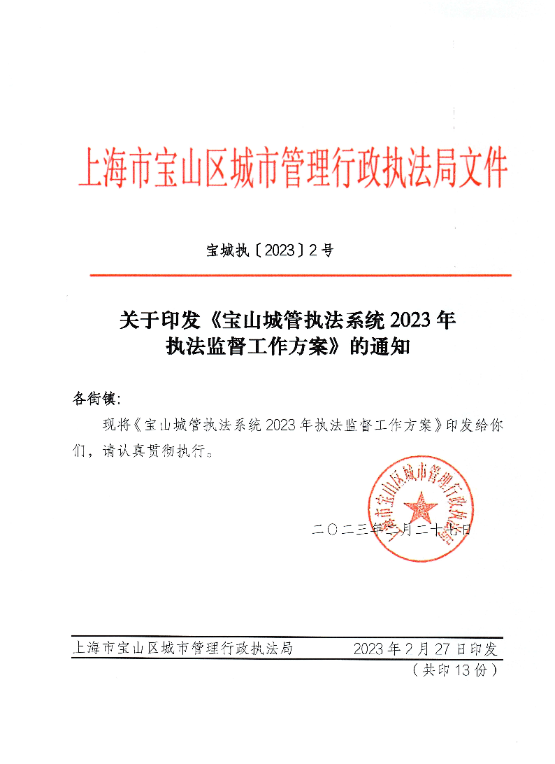 ??現(xiàn)將《寶山城管執(zhí)法系統(tǒng)2023年執(zhí)法監(jiān)督工作方案》印發(fā)給你們,請認真貫徹執(zhí)行。