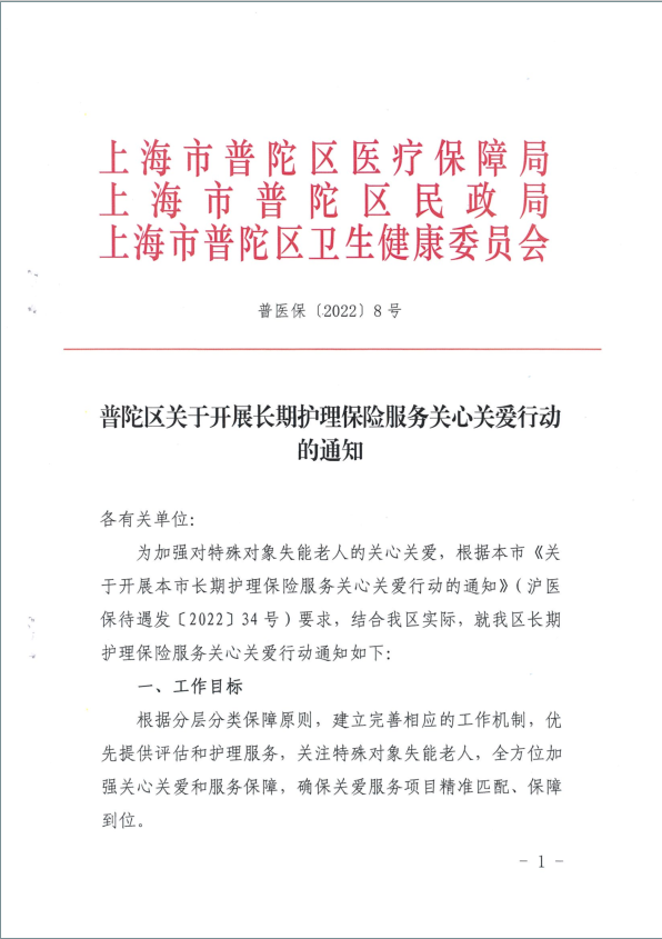 ??為加強(qiáng)對特殊對象失能老人的關(guān)心關(guān)愛,根據(jù)本市《關(guān)于開展本市長期護(hù)理保險(xiǎn)服務(wù)關(guān)心關(guān)愛行動(dòng)的通知》(滬醫(yī)保待遇發(fā)〔2022〕34號)要求,結(jié)合我區(qū)實(shí)際,就我區(qū)長期護(hù)理保險(xiǎn)服務(wù)關(guān)心關(guān)愛行動(dòng)通知如下: