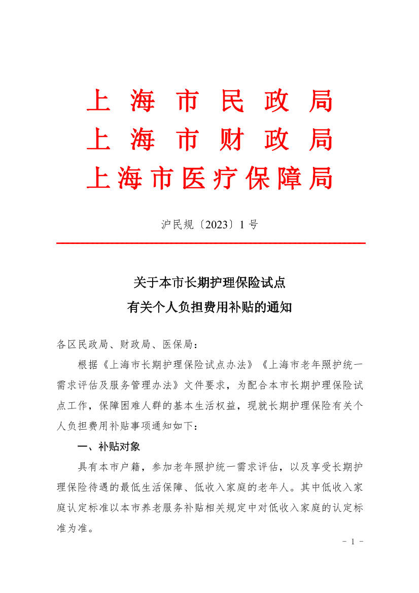 ??根據(jù)《上海市長期護(hù)理保險試點辦法》《上海市老年照護(hù)統(tǒng)一需求評估及服務(wù)管理辦法》文件要求,為配合本市長期護(hù)理保險試點工作,保障困難人群的基本生活權(quán)益,現(xiàn)就長期護(hù)理保險有關(guān)個人負(fù)擔(dān)費用補貼事項通知如下: