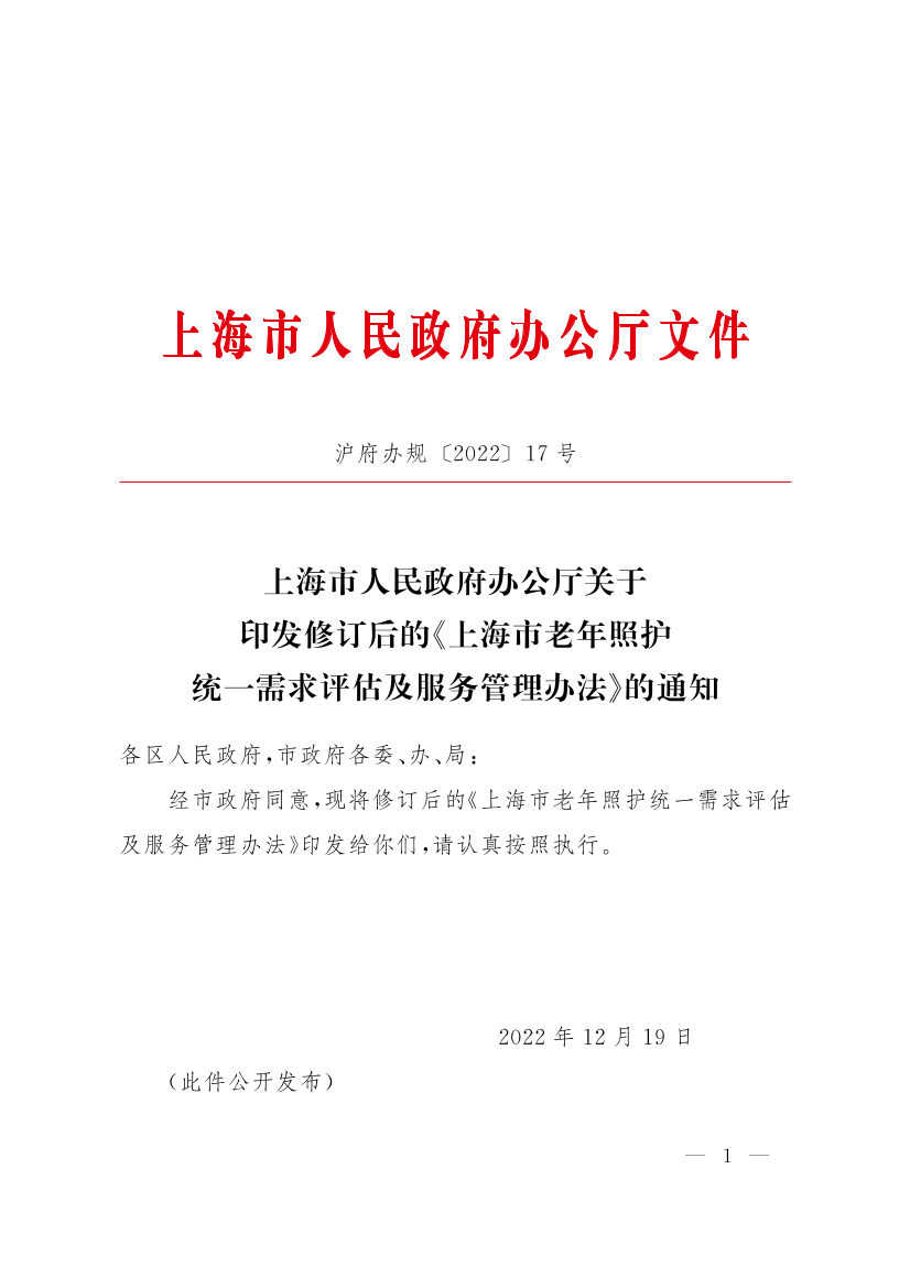 上海市人民政府辦公廳關(guān)于印發(fā)修訂后的《上海市老年照護(hù)統(tǒng)一需求評(píng)估及服務(wù)管理辦法》的通知