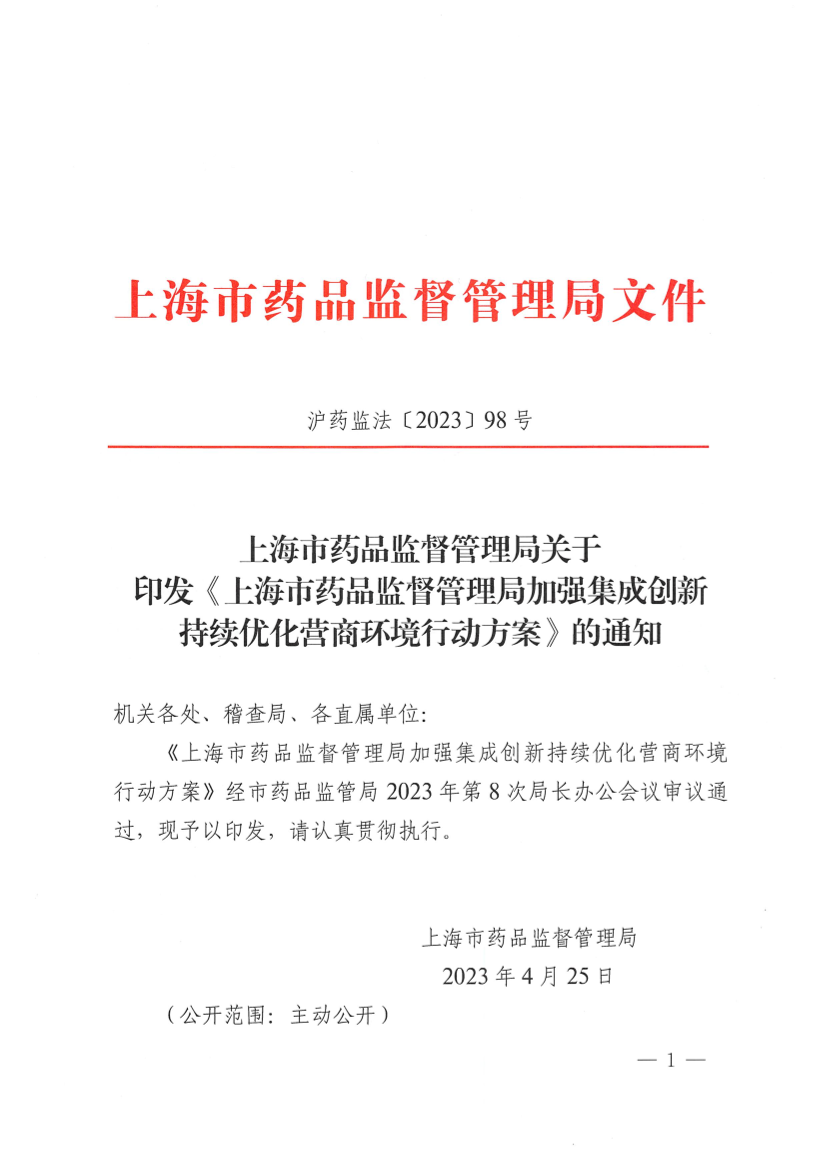 為深入貫徹落實《上海市加強集成創(chuàng)新持續(xù)優(yōu)化營商環(huán)境行動方案》(滬府辦規(guī)〔2023〕1號),結(jié)合本市藥品監(jiān)管工作實際,制定本方案。