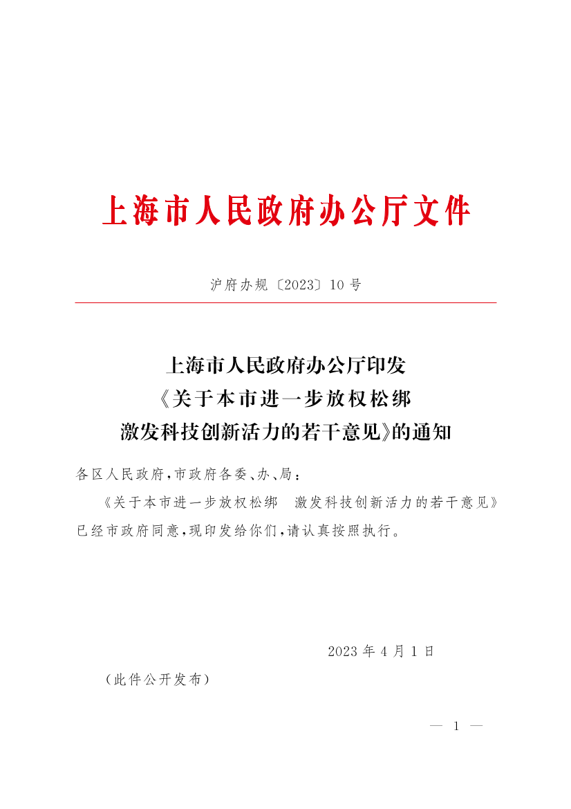 上海市人民政府辦公廳印發(fā)《關(guān)于本市進(jìn)一步放權(quán)松綁激發(fā)科技創(chuàng)新活力的若干意見》的通知