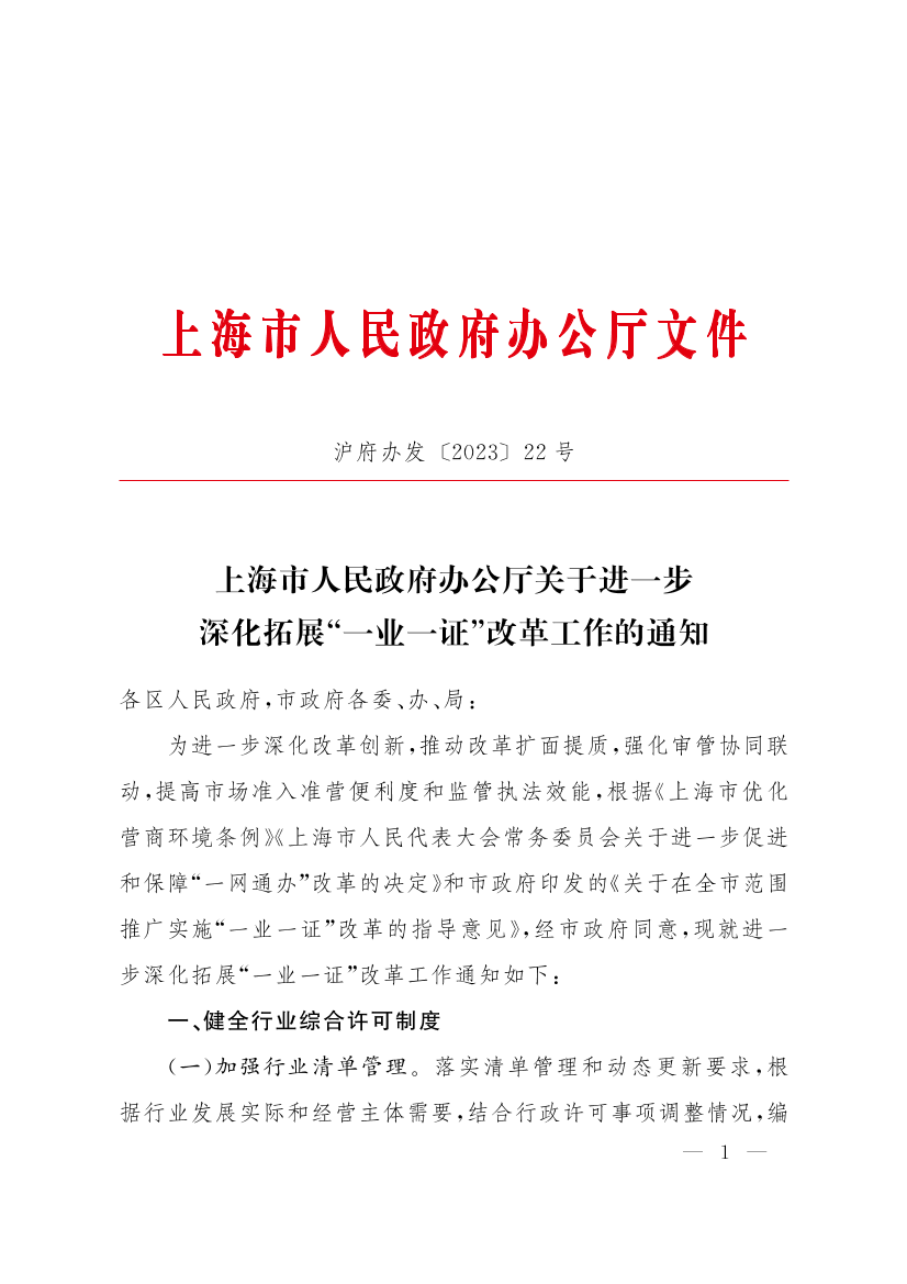 ??為進(jìn)一步深化改革創(chuàng)新,推動(dòng)改革擴(kuò)面提質(zhì),強(qiáng)化審管協(xié)同聯(lián)動(dòng),提高市場(chǎng)準(zhǔn)入準(zhǔn)營(yíng)便利度和監(jiān)管執(zhí)法效能,根據(jù)《上海市優(yōu)化營(yíng)商環(huán)境條例》《上海市人民代表大會(huì)常務(wù)委員會(huì)關(guān)于進(jìn)一步促進(jìn)和保障“一網(wǎng)通辦”改革的決定》和市政府印發(fā)的《關(guān)于在全市范圍推廣實(shí)施“一業(yè)一證”改革的指導(dǎo)意見(jiàn)》,經(jīng)市政府同意,現(xiàn)就進(jìn)一步深化拓展“一業(yè)一證”改革工作通知如下: