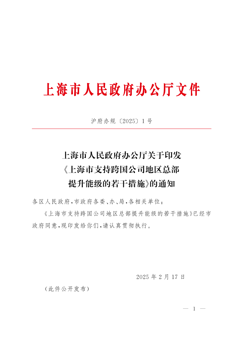 上海市人民政府辦公廳關(guān)于印發(fā)《上海市支持跨國公司地區(qū)總部提升能級的若干措施》的通知