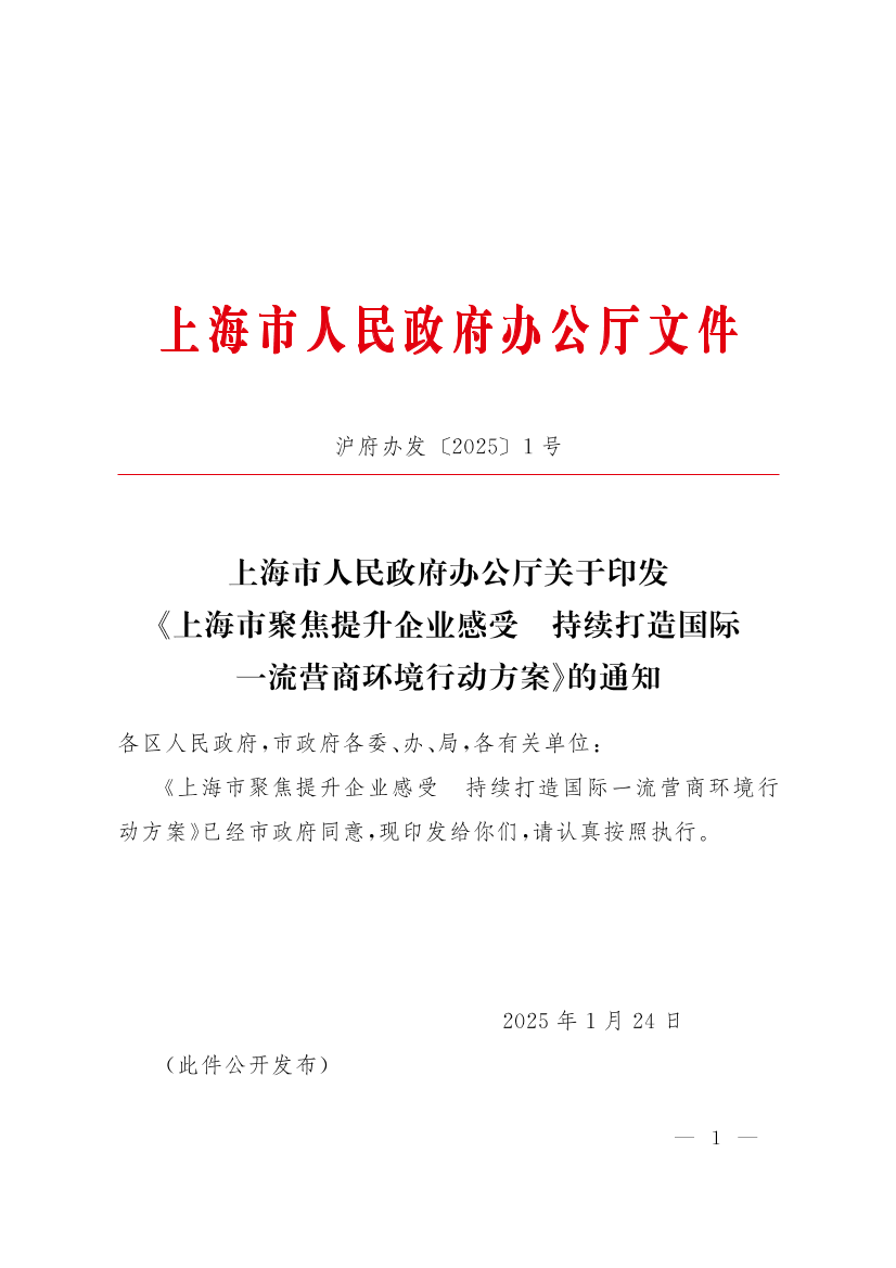 ??《上海市聚焦提升企業(yè)感受 持續(xù)打造國際一流營商環(huán)境行動方案》已經(jīng)市政府同意,現(xiàn)印發(fā)給你們,請認(rèn)真按照執(zhí)行。